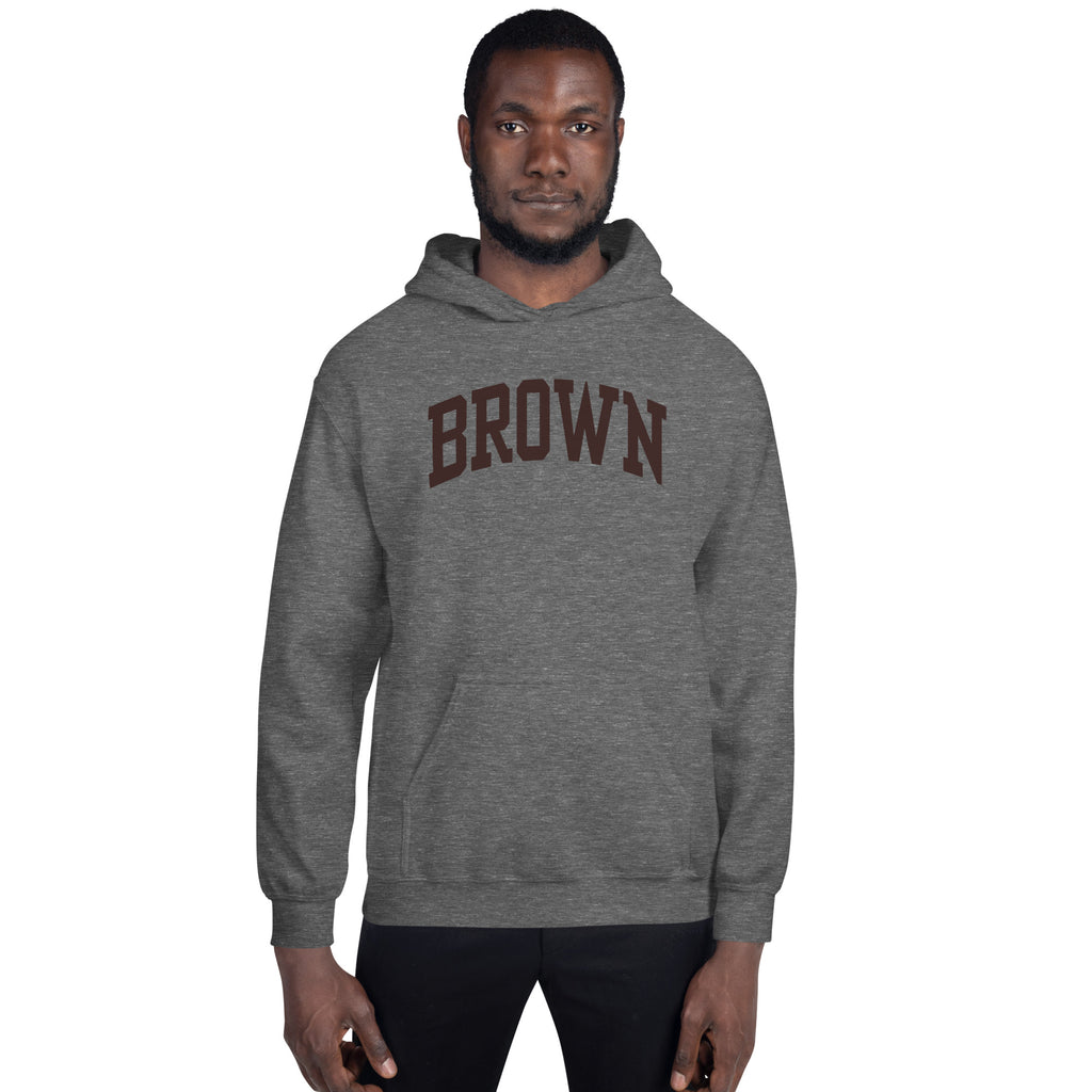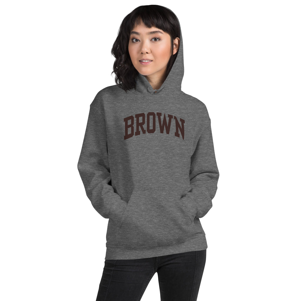 Brown University Essential Hooded Sweatshirt. Front graphic "Brown" in brown.