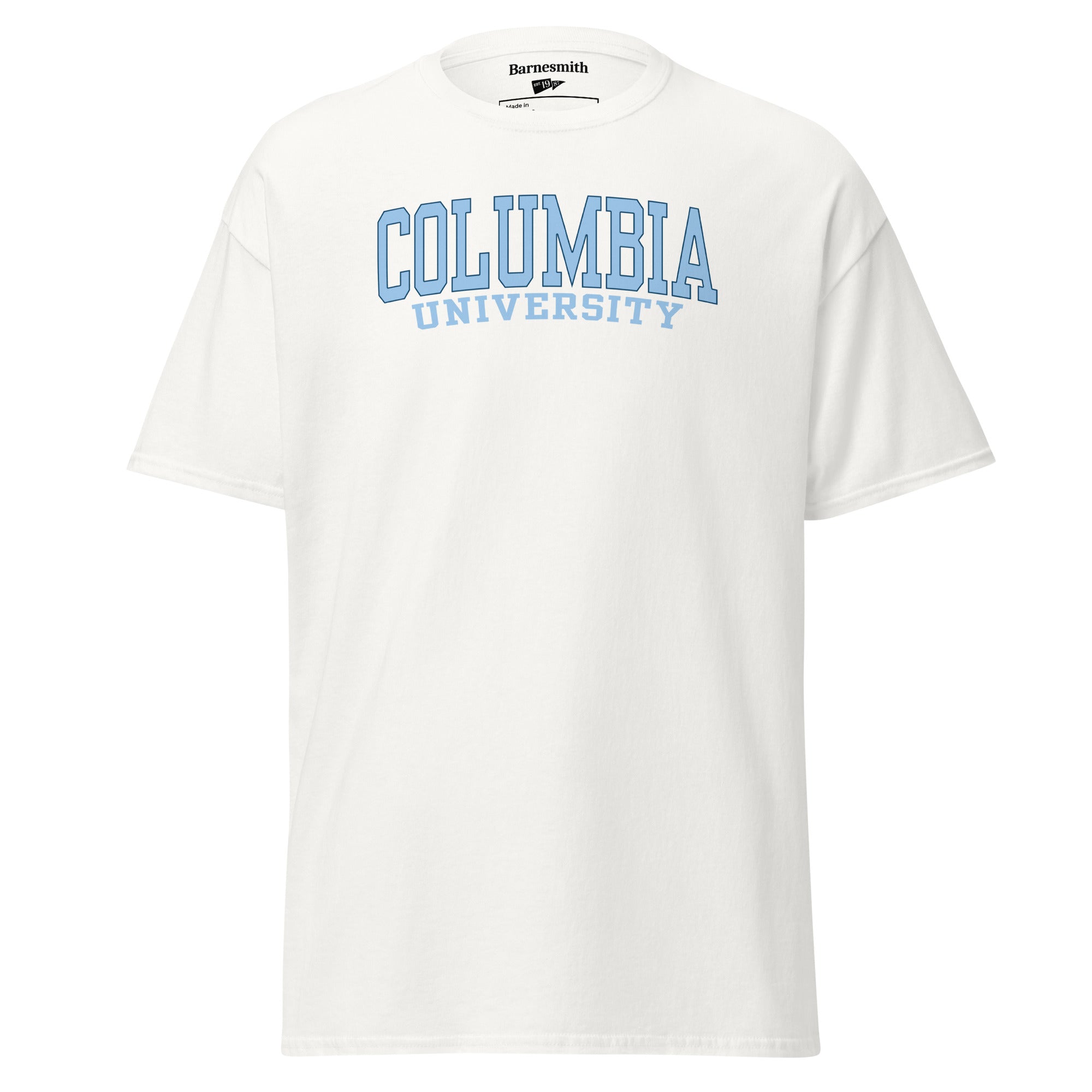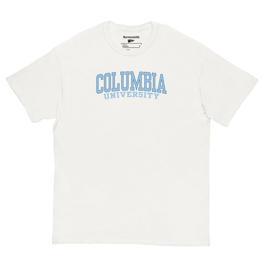Columbia University Classic t-shirt features arched "Columbia" in light blue with navy outline and "University" below in light blue.