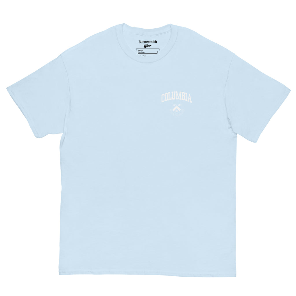Columbia Scholar T-shirt features arched "Columbia" and Columbia crest on left chest.