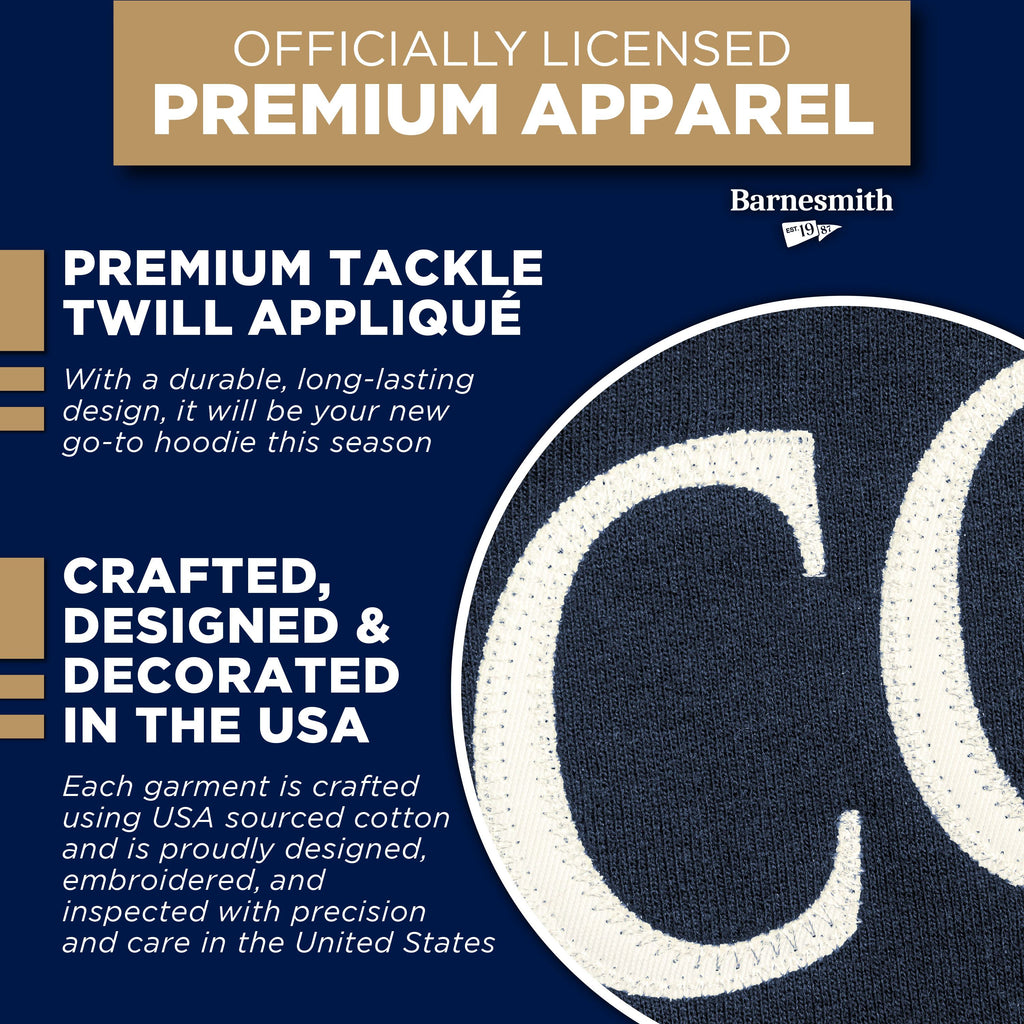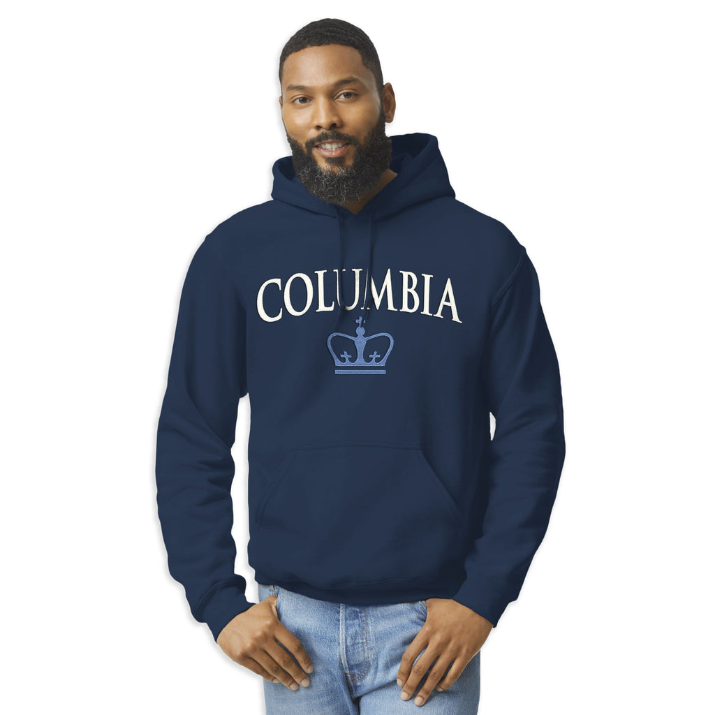 Columbia University Veritas Hooded Sweatshirt features "Columbia" and logo on front. Garment is a rugged 8.0 oz., feature draw strings on hood and pouch pocket in front, 50% cotton / 50% polyester. Color: Navy. Manufactured and Officially Licensed by New Agenda for Ivysport.