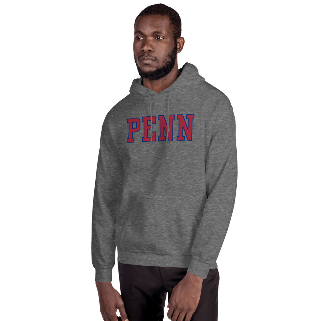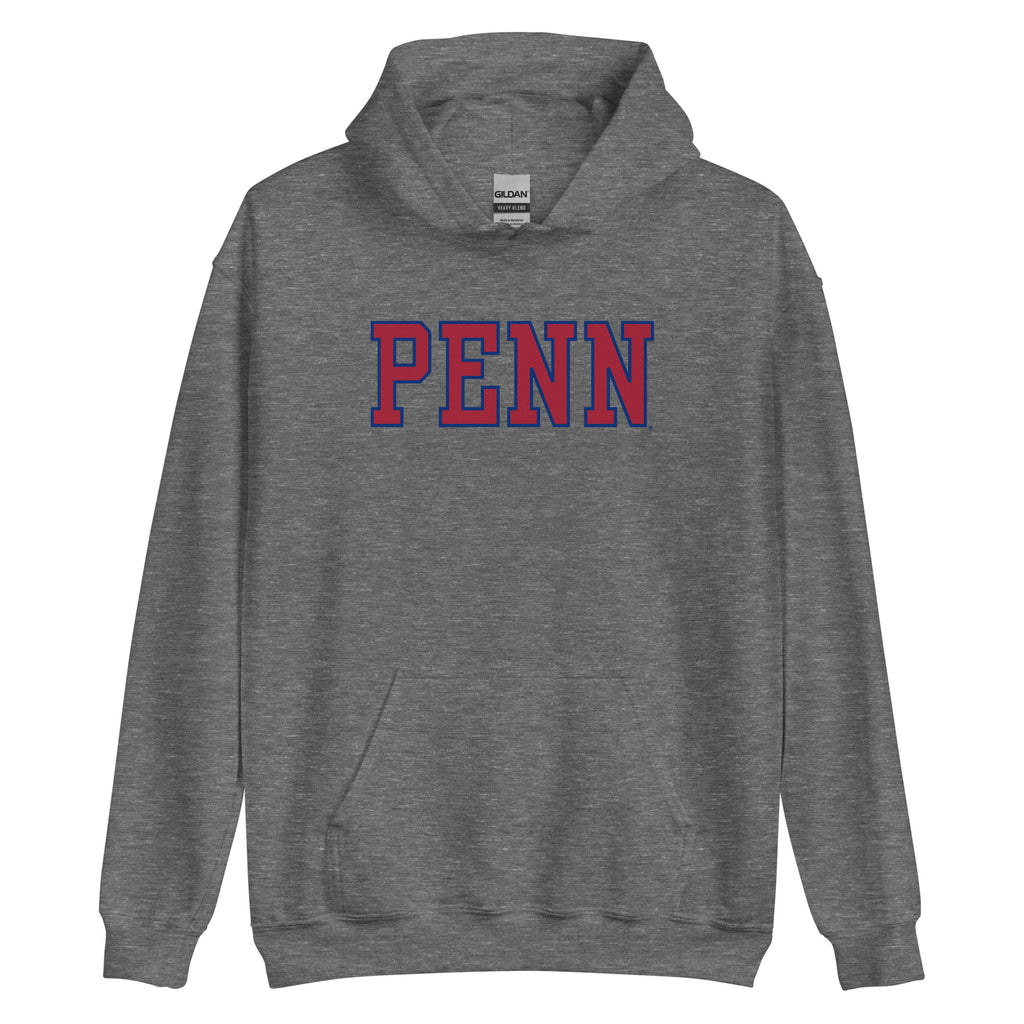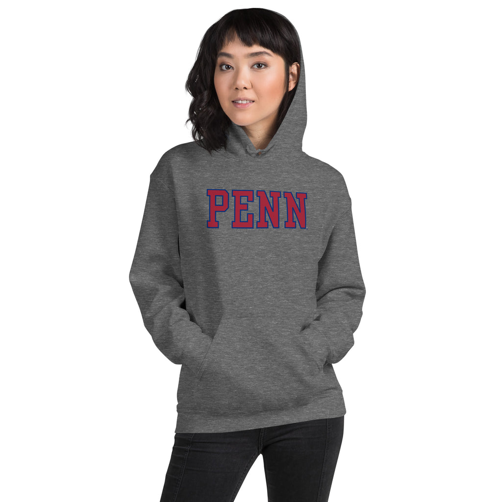 University of Pennsylvania Essential hooded sweatshirt. Front graphic "Penn" in red w/blue trim.