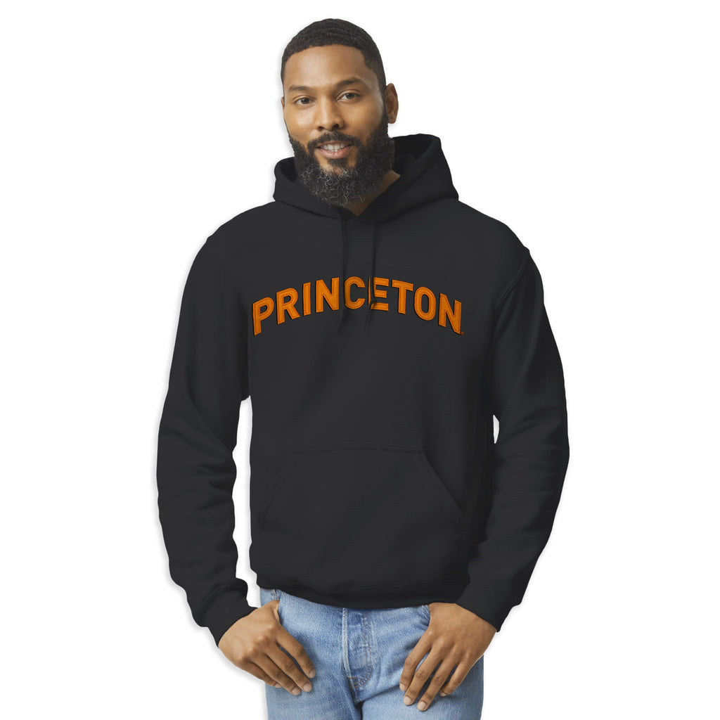 Princeton University Veritas Hooded Sweatshirt features "Princeton" on front. Garment is a rugged 8.0 oz., feature draw strings on hood and pouch pocket in front, 50% cotton / 50% polyester. Color: Black. Manufactured and Officially Licensed by New Agenda for Ivysport.