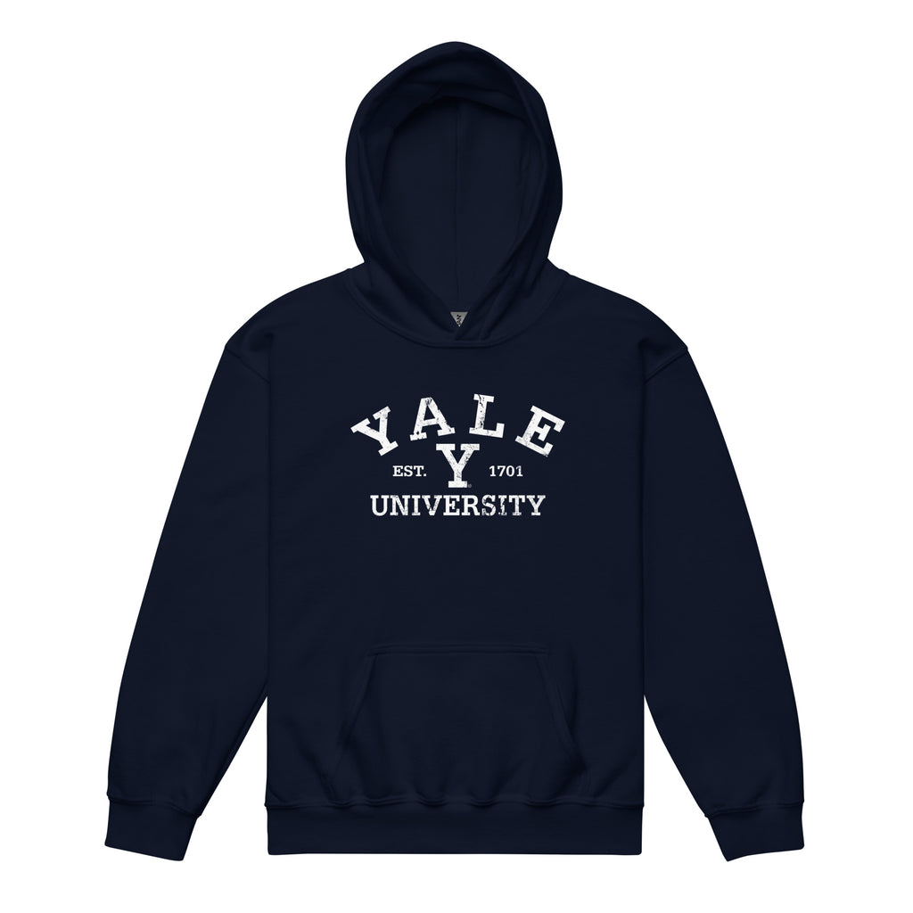 Yale University Youth Size hooded sweatshirt features "Yale University" officially established year on front.